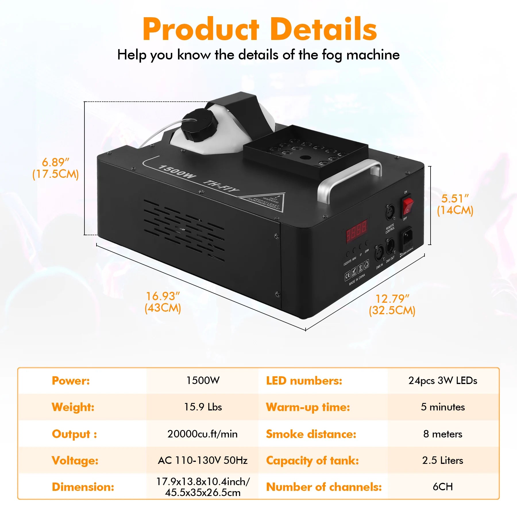 - Dynamic Fog Production: Generates a dense fog that enhances visual effects, making lights beam through the air for a mesmerizing display.