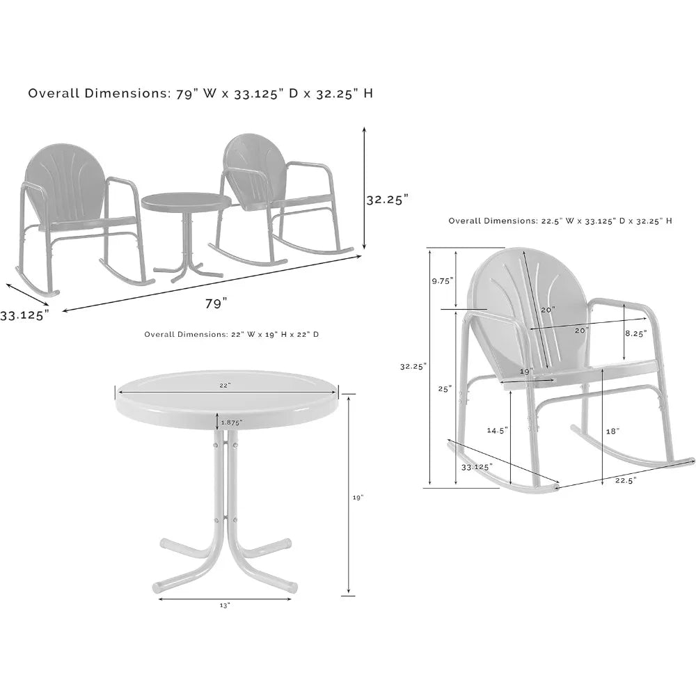 Whether you’re sipping morning coffee, sharing sunset chats with a friend, or enjoying a quiet moment of solitude, this patio rocking chair set adapts to small balconies and larger porches alike. The compact 22" side table keeps essentials within reach, while the generous chair dimensions offer ample seating comfort for a range of body types.