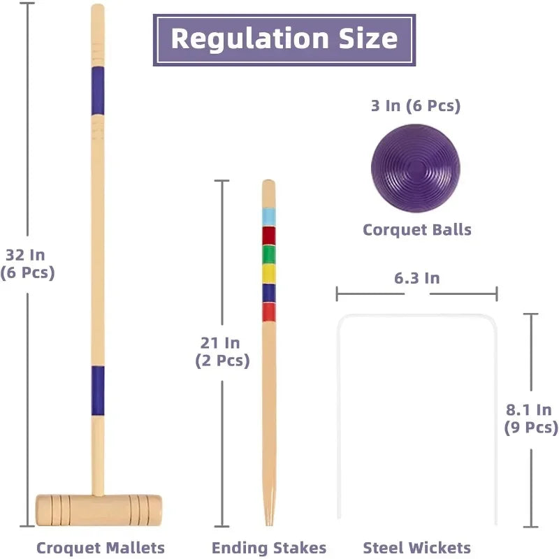 - Set Includes: 6 mallets, 6 balls, 9 wickets, and stakes