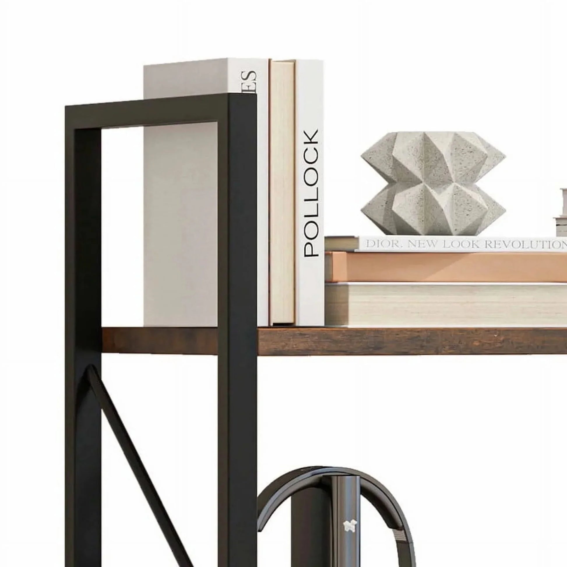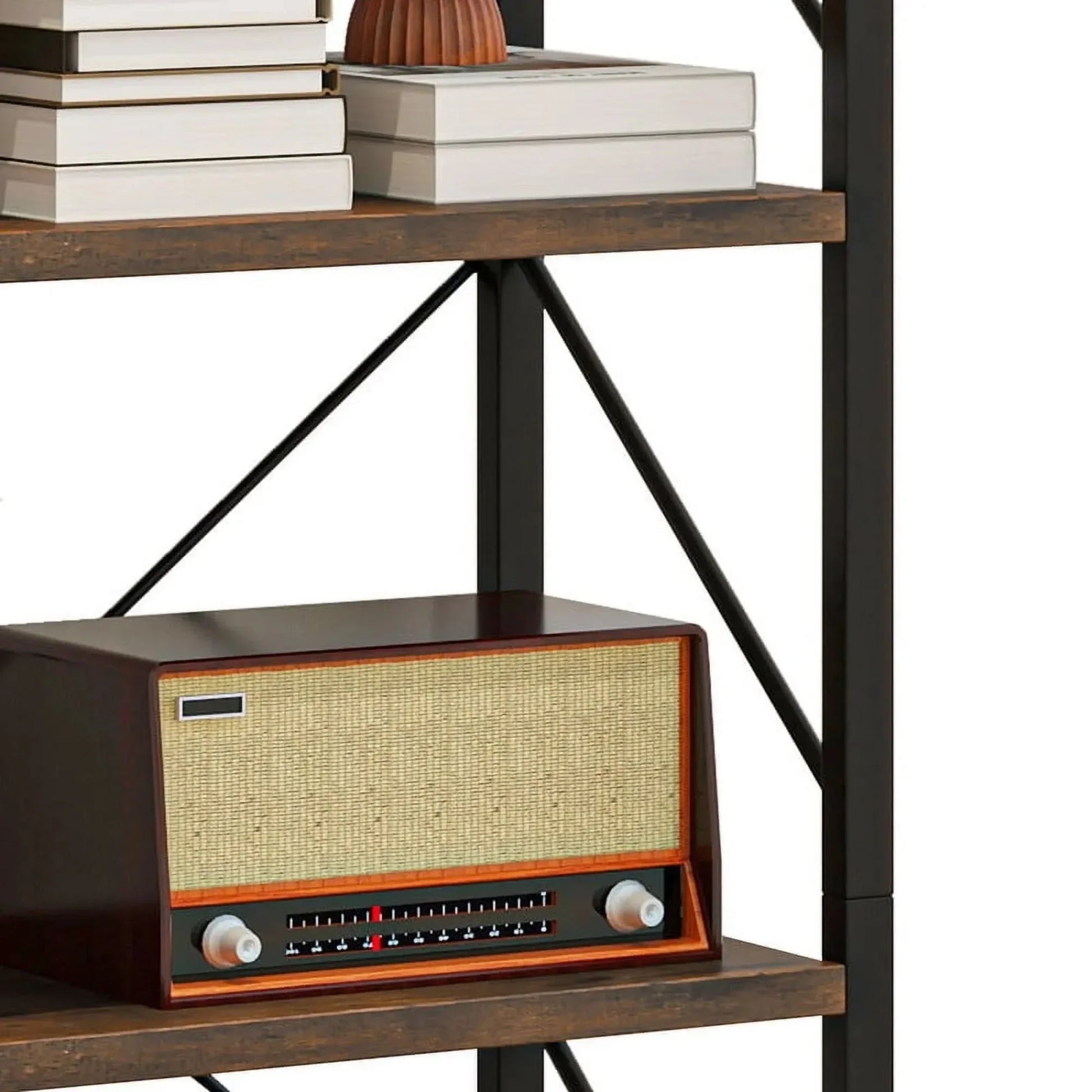 - Five open shelves offer ample display and storage for books, decor, photos, plants, and more.