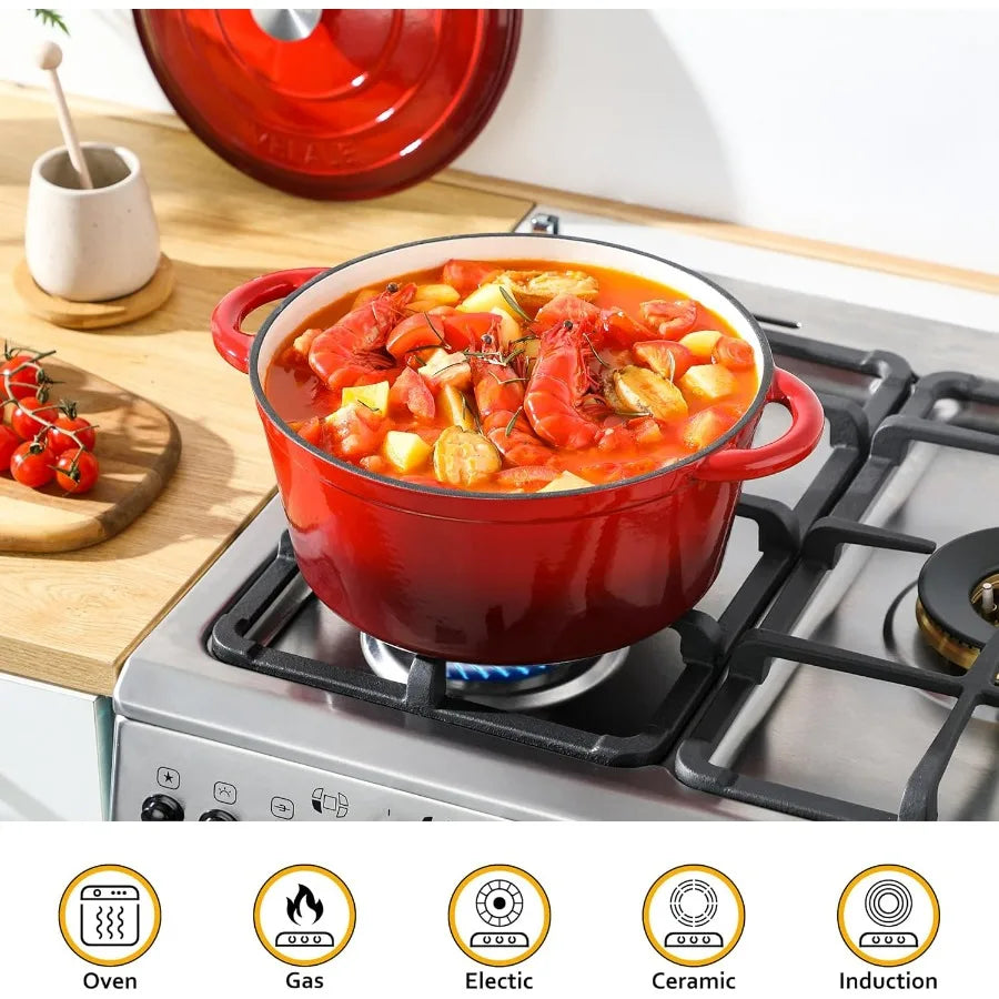 【CAST IRON DUTCH OVEN】 enamel cast iron dutch oven pot with lid is solid and durable, can be used for multiple cooking methods such a cooking, baking, stewing etc. Large capacity dutch oven is great for beginners or pros and almost meet all the needs of family gatherings. Please always use oven gloves or a pot rack when handling the pot. The handle will be very hot!