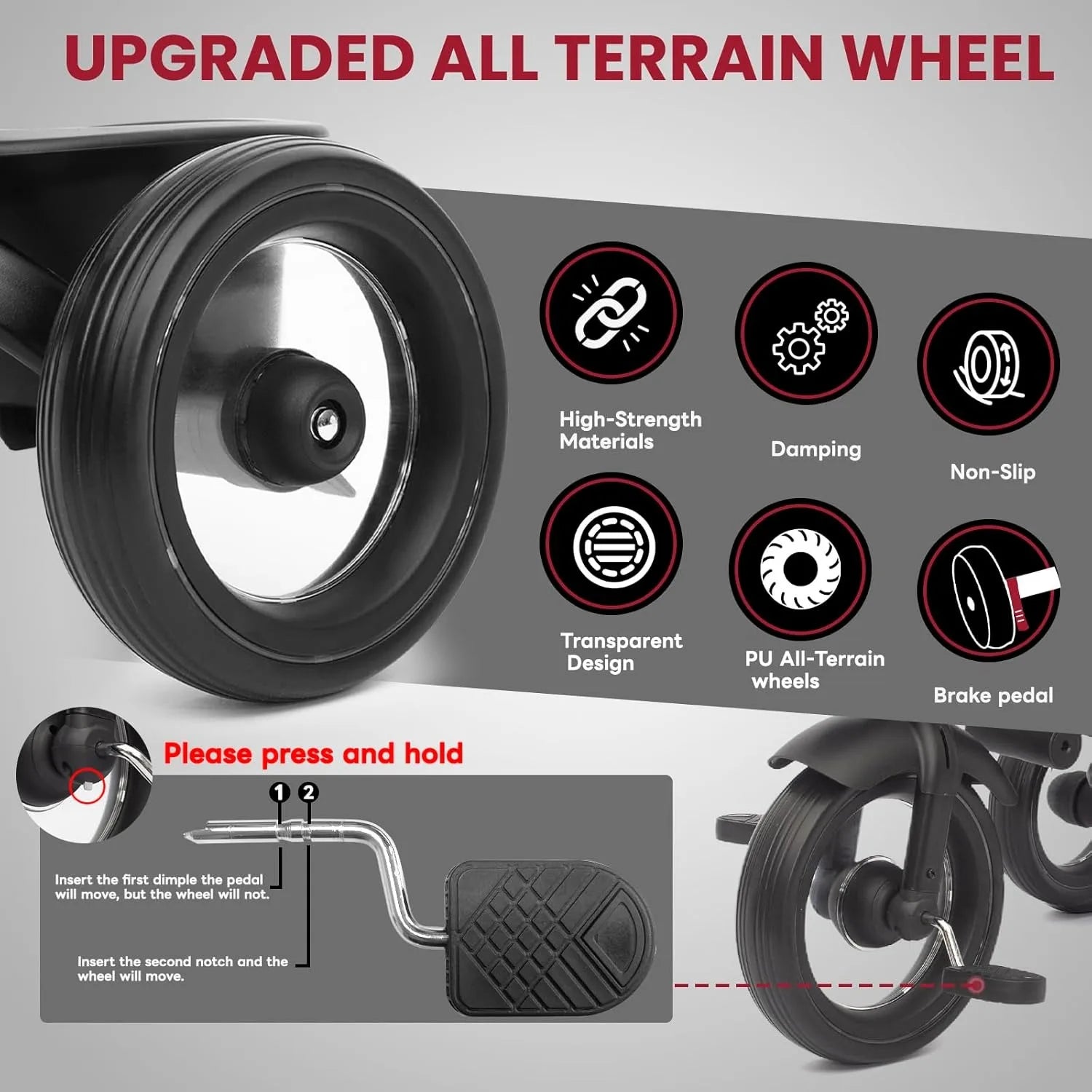 - Seven stages in one: Easily switch among push tricycle, toddler tricycle, steering tricycle, training tricycle, and standard tricycle configurations as your child grows.