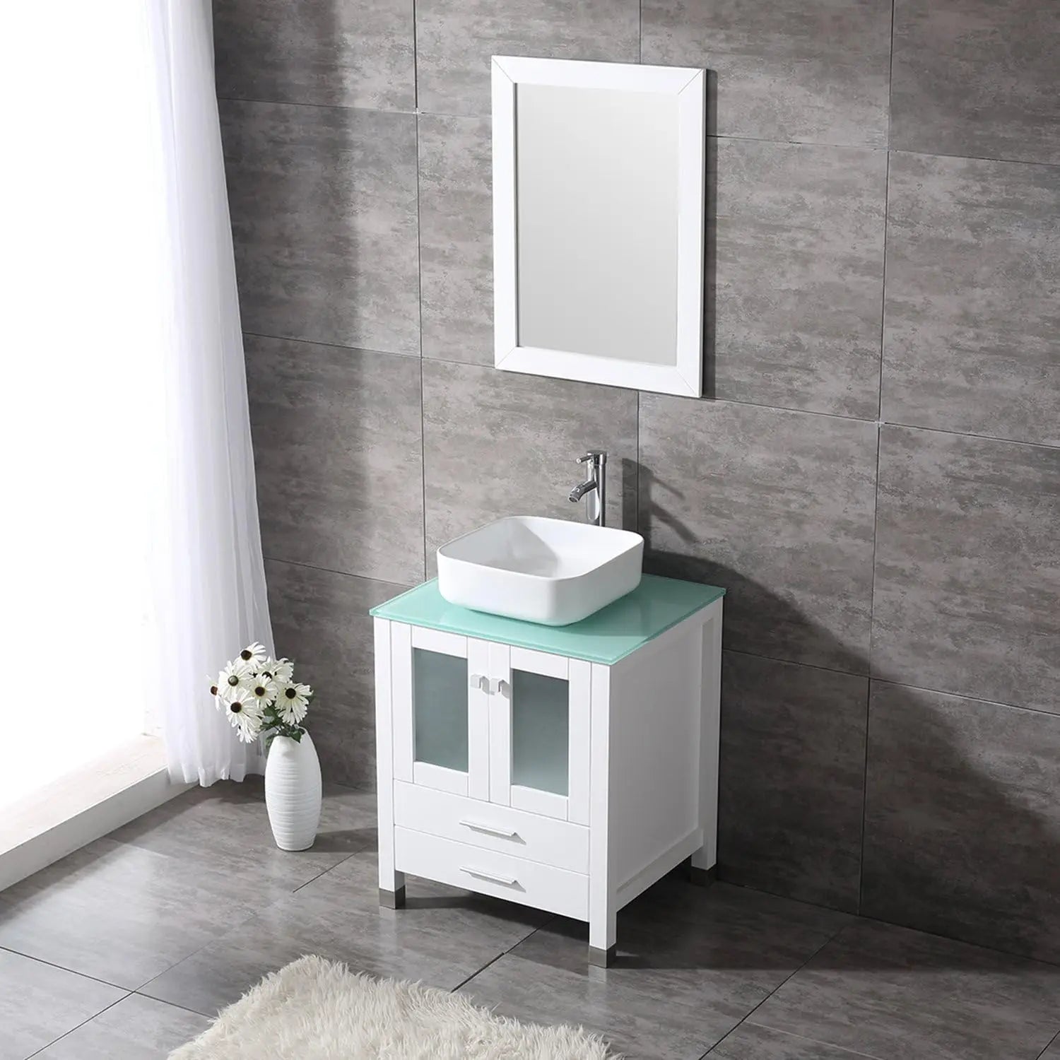 - All-in-one package — MDF wood cabinet + ceramic square vessel sink, 12" faucet, pop-up drain, and mirror included for fast, coordinated installation.