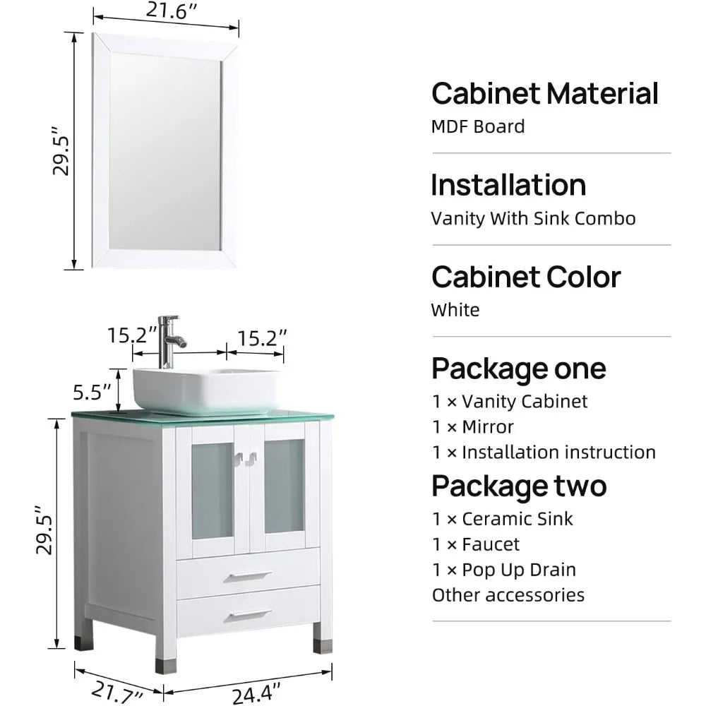 Porch and Petal Market — Black 24" Bathroom Vanity Combo: a modern, space-saving all-in-one solution that pairs a durable MDF cabinet with a sleek ceramic square vessel sink, matching faucet, pop-up drain and mirror for a complete, polished bathroom upgrade.