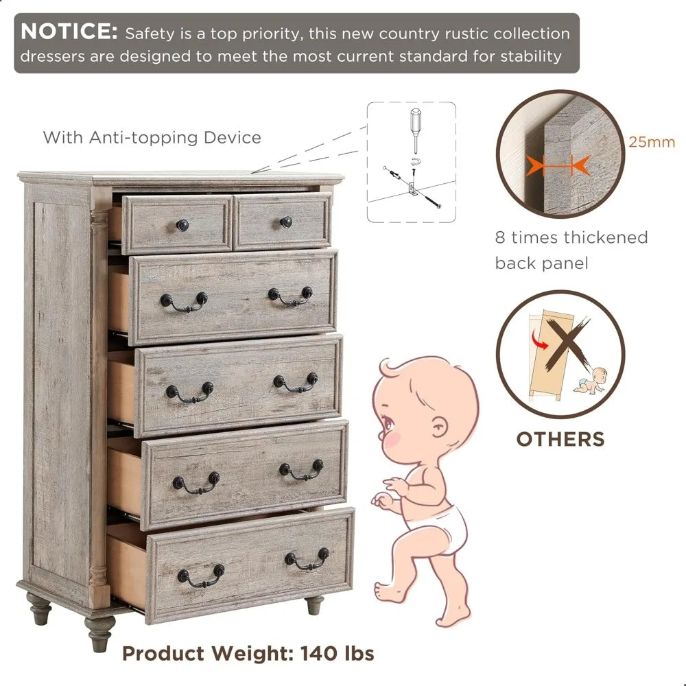 Bring timeless country charm to your bedroom with the Farmhouse 6 Drawers Dresser — a tall, rustic chest that blends classic column detailing and distressed light oak finish with modern, practical storage.