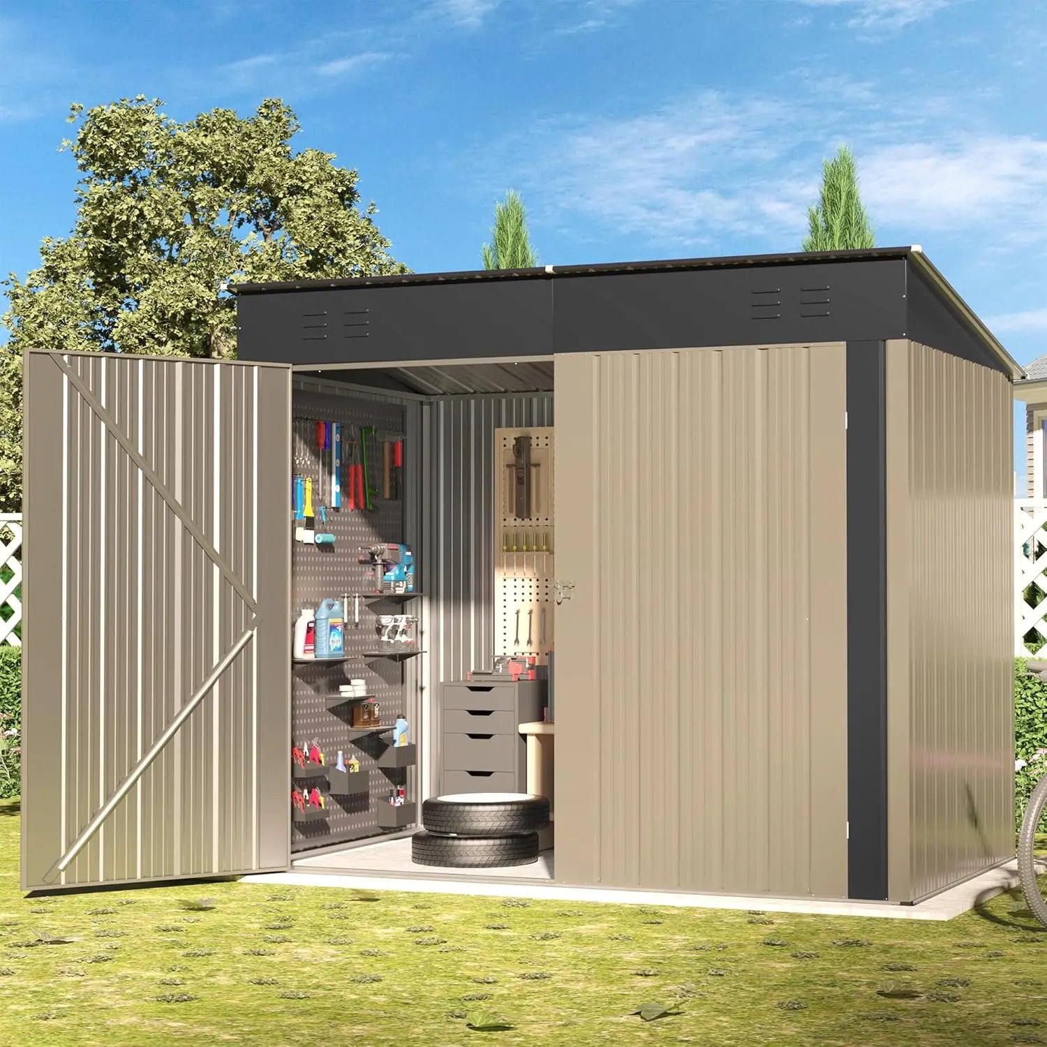 Constructed from sturdy metal, this waterproof shed stands up to sun, rain, and seasonal changes. Its compact footprint fits comfortably in most gardens and yards, offering a practical storage solution without taking up excessive space.