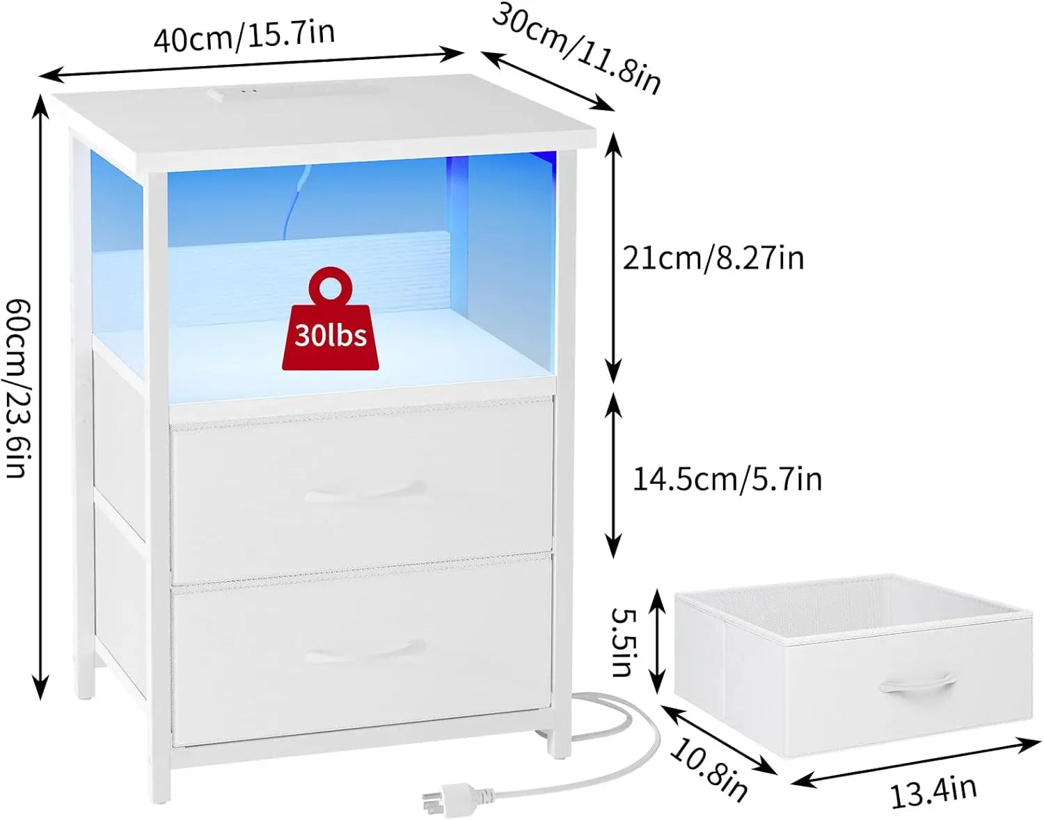 Thoughtfully designed for contemporary living, these twin nightstands combine style and function: a built-in charging station for phones and tablets, an energy-efficient LED light for gentle nighttime illumination, and a roomy fabric drawer for clutter-free bedside organization.