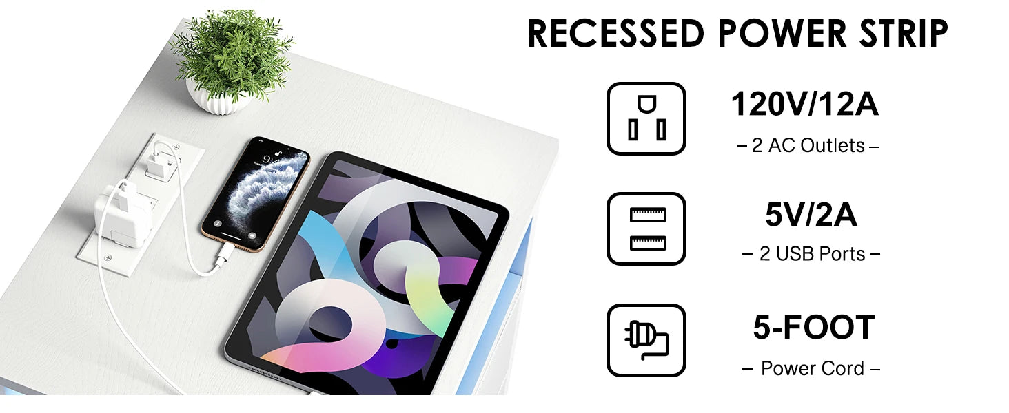 - Integrated Charging Station — convenient USB ports and tabletop space to power devices overnight without extra cords.