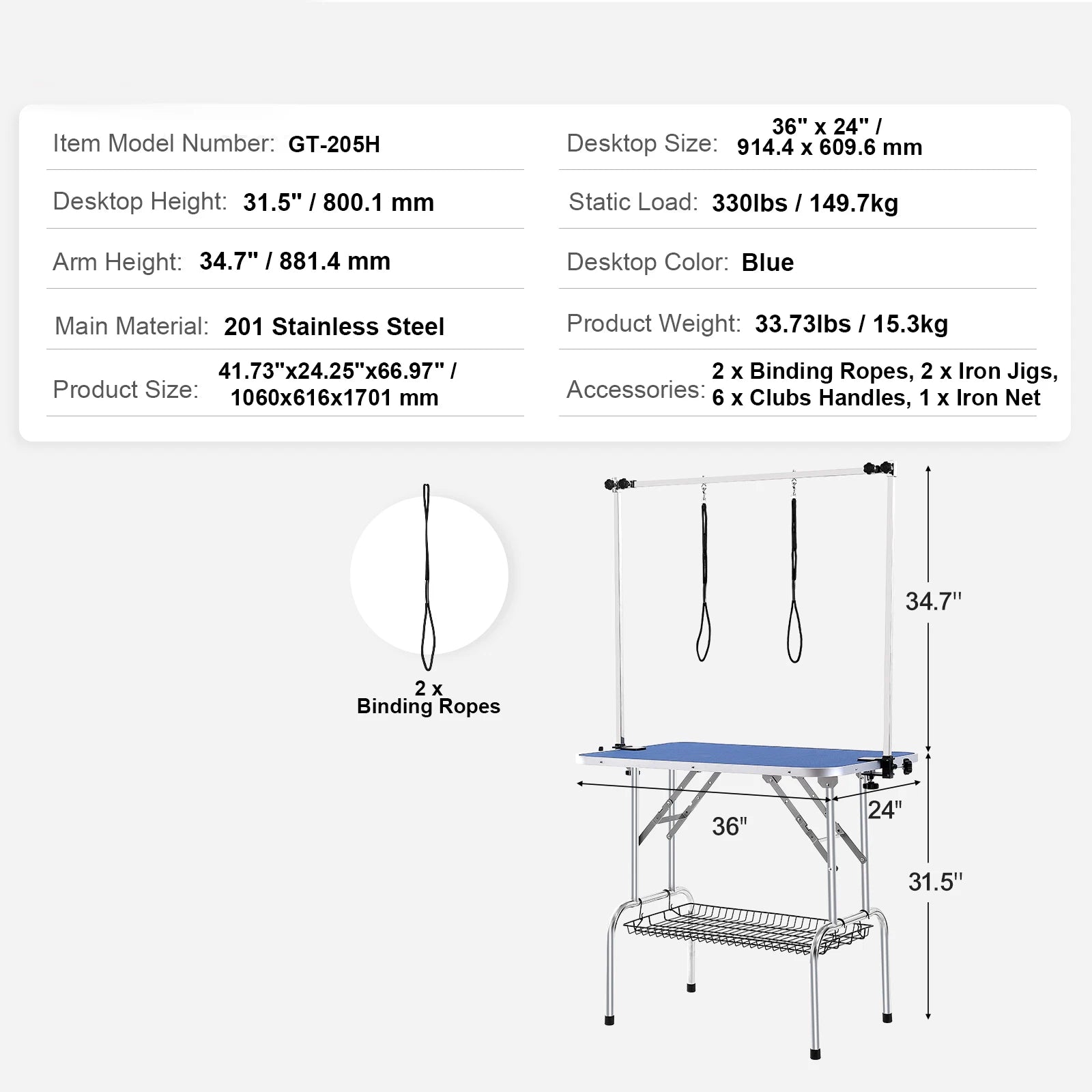 - Quick setup and teardown—four simple steps: unfold the frame, secure the clamps, attach the H-shaped arms, and add the storage shelf. You’re ready to groom in minutes, not hours.