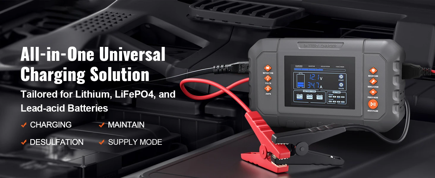 The SucceBuy 35A Smart Battery Charger is designed to charge, maintain, and desulfate a wide variety of batteries; It’s compatible with lead-acid (6/12/24V), lithium (12/24V), and LiFePO4 (12/24V) batteries, making it a versatile solution for all your power needs; This all-in-one charger serves as a battery maintainer, trickle charger, and desulfator, ensuring optimal battery performance year-round; Whether you're powering up your car, boat, motorcycle, or lawn mower, this charger covers it all with ease.