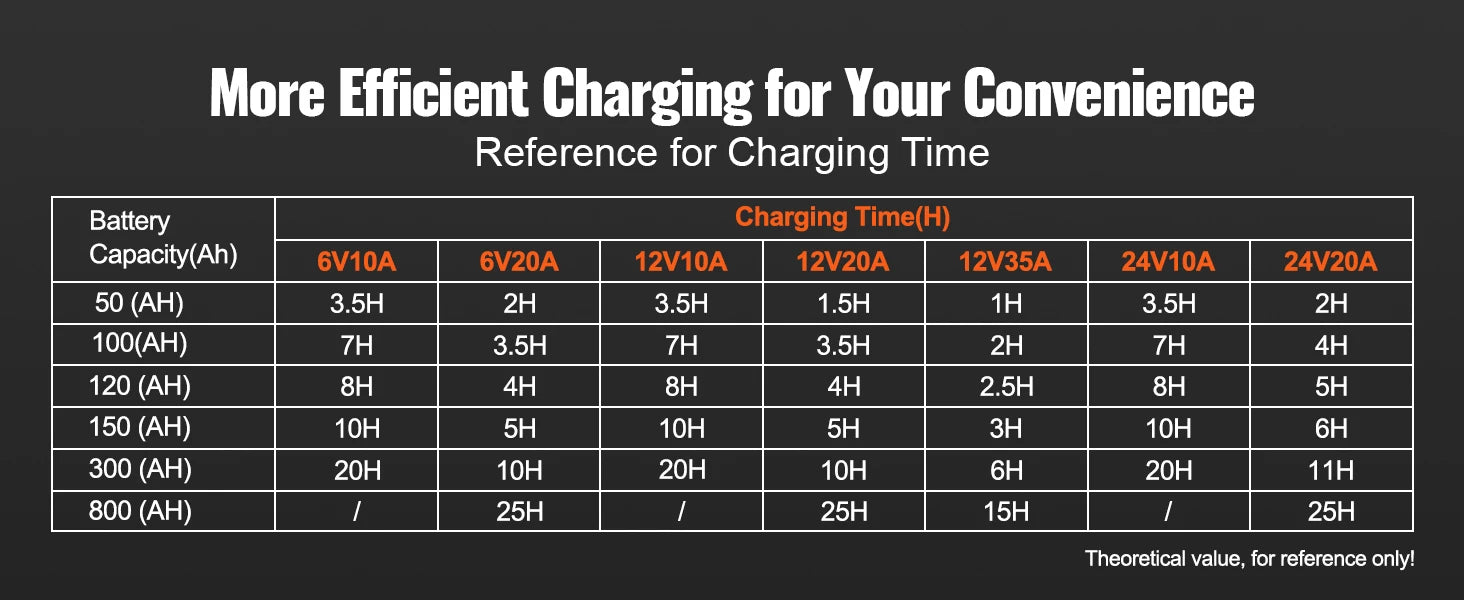 Charging Current: 10A (6V), 20A (6V), 10A (12V), 20A (12V), 35A (12V), 10A (24V), 20A (24V), Auto (6V, 12V, 24V)