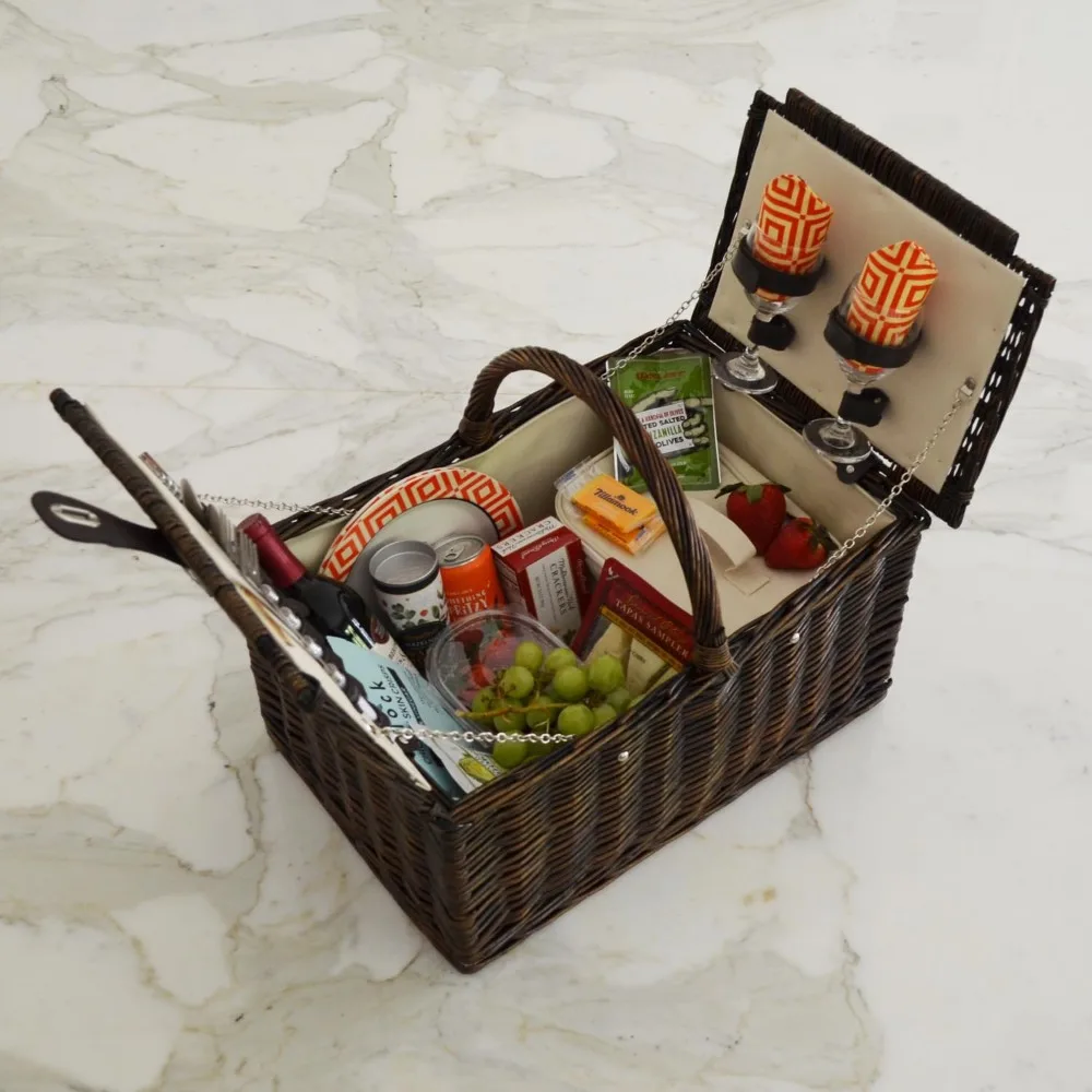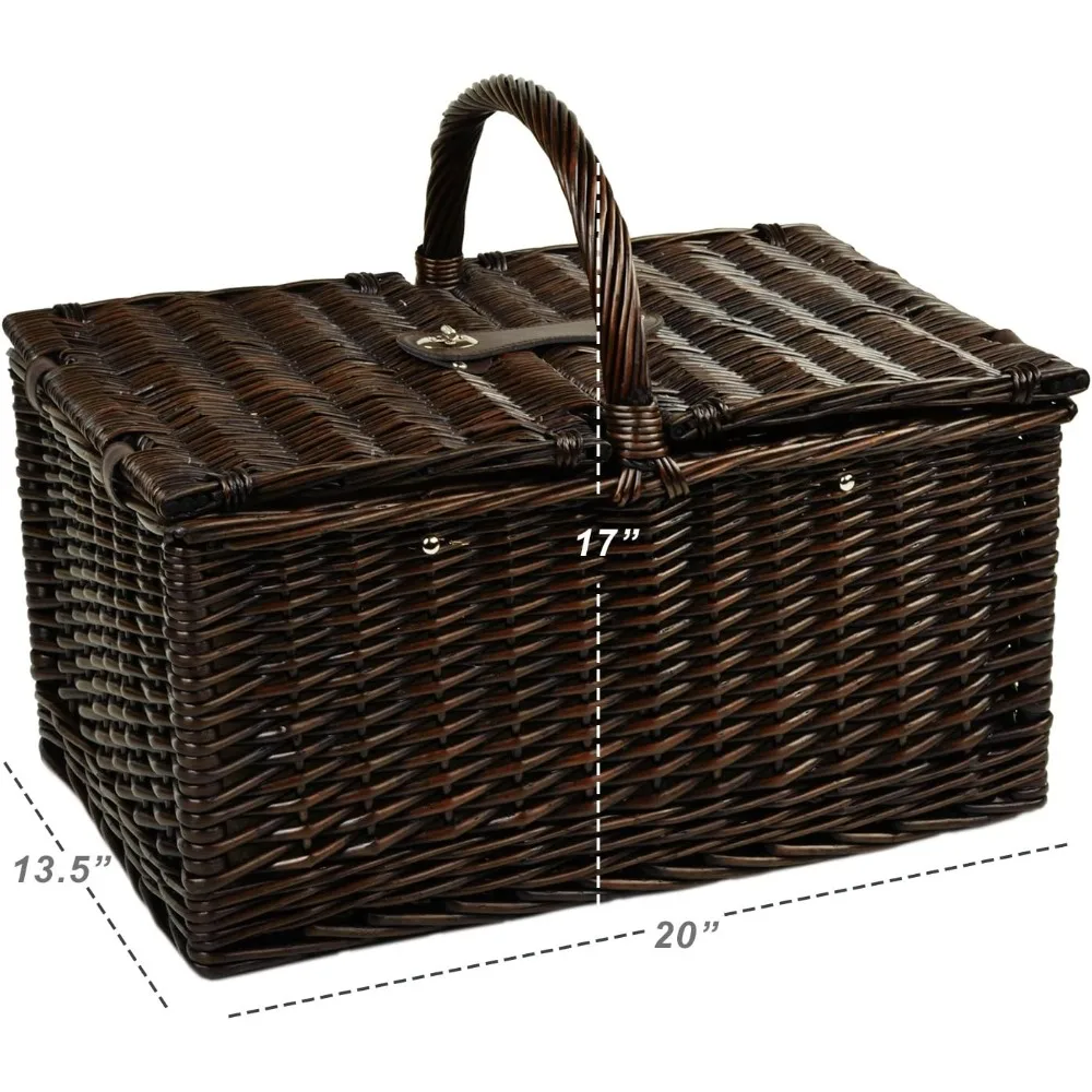 This product is a luxurious, handcrafted picnic basket that is fully lined and designed to serve two people. It features dimensions of 20 inches wide, 13.5 inches deep, and 10 inches high, excluding the handle. The basket comes with a complete picnic set, which includes 9-inch melamine plates, matching cotton napkins, glass wine glasses, stainless steel cutlery, a corkscrew, and an insulated food cooler. Ideal for outdoor events like concerts and park picnics, this basket is also a perfect gift for weddings. It is proudly designed and assembled in the USA and comes with a lifetime warranty.